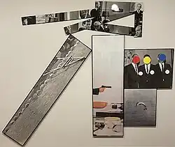 Circular adhesive dots covering up the faces of photographed and painted portraits are a prevailing motif in Baldessari's work from the mid-1980s onward.[27] The artist himself suspected that, despite the broad array of approaches he's taken over the course of his career, he will be best remembered as "the guy who puts dots over peoples faces."[28] Examples of the "dot portraits" would include—for example—Bloody Sunday (1987) or Stonehenge with Two Persons (2005), though these works are numerous and it is difficult to identify an exemplar. The dots in these paintings evoke brightly colored price-stickers sometimes seen at garage sales, thrift stores or placed on retail items during a sale. Indeed, these stickers appear to have been the inspiration for the method. Describing his initial intuitive leap in this direction, Baldessari said, "I just had these price stickers I was using for something else, in some graphic way and I put them on all the faces and I just felt like it leveled the playing field."[29] The dot-faced works may sometimes be described as paintings, collages, or may be released as print editions.