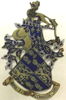 ![]() Garter stall plate of John Beaumont, 4th Baron Beaumont. Beaumont quartering Comyn | |