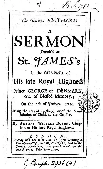 In 1712 Jacobi was already married; the baptism of his son John Owen with Mary Magdalen Jacobi was recorded in June 1712 at St Paul's, Covent Garden. Jacobi's bookshop moved to Southampton Row on the Strand in the same year. In 1714 he was appointed "chapel-keeper" (or verger) of the Royal German Chapel, St James's Palace, which provided Lutheran services for the Hanoverian court. The first chaplain there was Francke's main associate in England, Anthony William Boehm, a close friend of Jacobi. In 1717 he moved his business further along the Strand to the less expensive Exeter Exchange, which housed a number of foreign language bookshops. Although Jacobi had tried to diversify to serve a French readership, he stopped selling books by 1719. His German bookshop was the first of its kind in England and it was 30 years before another one opened in London.[1]
