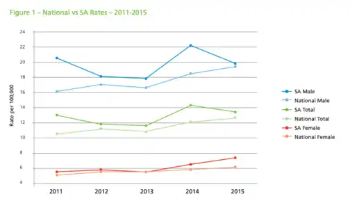 Suicide is the leading cause of death for South Australians between the age of 15 and 44.[9] Within the indigenous community this rate is more than doubled. In 2019 the ABS released statistics that showed a reduction in the suicide rate for South Australia, down from 12.8% to 12% in one year (2017-2018).[10] This statistic marks a 6.8 percent decrease and places South Australia below the national average.