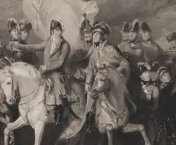 As a colonel in the 1st Regiment of Life Guards, Sir John was appointed Deputy Adjutant-General of Cavalry at the start the Waterloo Campaign.[13][14] Two days after attending the Duchess of Richmond's Ball, he led the charge of the Life Guards during the holding action at Genappe during the Anglo-allied retreat from Quatre Bras to Waterloo.[15] He was severely wounded during the subsequent battle.[16] Sir Walter Scott, in Paul's Letters to his Kinsfolk, described his feats at the attack on the escarpment of Mont-Saint-Jean, a ridge to the south of the village of Waterloo: