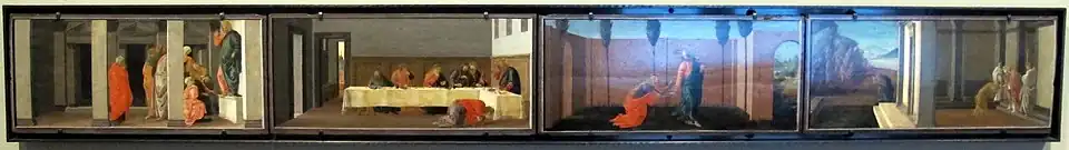 Undoubtably the rarest works and those upon which an orthodox collection rests most securely for its prestige are to be found among the Italian paintings. There are Pesellino's Virgin and Child Between Two Saints, an early Corregio, a portrait by Botticelli of extreme historical as well as aesthetic interest, and a beautiful predella by that master recounting the legend of Mary Magdalen, a magnificently dramatic Pietà by Crivelli, and a decorative pair of panels by Cima da Conegliano, Carpaccio's tender Story of Alcione, a Virgin and Child by Giovanni Bellini, a Magdalen Reading by Luca Signorelli, authentic specimens of Basaiti and Catena, and other paintings that in more than one instance represent masters to be found in but few of the great European galleries.