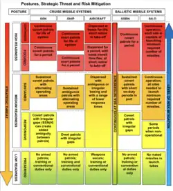 Gower's final professional naval post as Rear Admiral, in 2011-14, was to serve as Former Assistant Chief of Defence Staff (Nuclear, Chemical, Biological) in the United Kingdom Ministry of Defence.[8][9] In that role, Gower presided over the 2013 publication of the HM Government Trident Alternatives Review.[10] Having commanded nuclear-armed submarines, Gower was attentive to these weapons systems' role in the United Kingdom, as well as in NATO's strategic defenses. This report analyzes the role and credibility of nuclear deterrence and contrasts the effectiveness of various nuclear weapons systems.[10]: 4 Examining the topic of "credibility and constraints," the document puts forward clear statements about the nature of the UK's nuclear doctrine, deterrence credibility, extended and collective deterrence relevant to NATO, and legal constraints. The report delivers a detailed analysis of various nuclear warhead delivery platforms from large aircraft and submarines to mobile ballistic missile launchers.[10]: 16-17 It also compares different types of warheads from free fall bombs and cruise missile bombs to the UK Trident bomb.[10]: 19 It assesses several nuclear deterrence postures and credibility criteria, and considers the vulnerability of second strike forces. The Report concludes with a diagrammatic figure contrasting nuclear deterrence attributes of cruise and ballistic missiles, showing how as the perception of the threat of attack rises, the risks of attack are mitigated by increasing the readiness of deterrent forces.[10]: 58