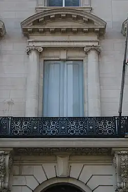 On the second through fourth stories, there are quoins at each corner of the building.[16] The second story of the facade is designed like a piano nobile, with three high French windows, each flanked by columns in the Ionic order.[16][18] Above each pair of columns are entablatures, which support segmentally arched pediments; the columns and pediments give the windows the appearance of aediculae, or Roman temples. Both of the outer second-story windows are recessed from the facade, and there were formerly wrought-iron window guards in front of each of these windows, with leaf and fruit motifs.[1] By the 1990s, the window guards in front of the outer windows had been removed.[16] There is also a balcony in front of the central window, with wrought-iron balustrade.[1]
