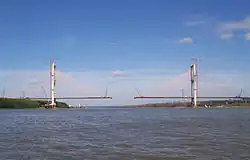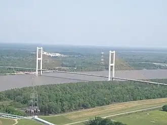 The John James Audubon Bridge, completed and opened in May 2011, is a Lower Mississippi River crossing between Pointe Coupee and West Feliciana parishes in south central Louisiana. The bridge has the third longest cable-stayed span (distance between towers) in the Americas at 1,583 ft (482 m), after Mexico's Baluarte Bridge with a 1,706 ft (520 m) span, and has a total length of 12,883 ft (3,927 m)—nearly three-and-a-half times longer than the Baluarte Bridge's 3,688 ft (1,124 m) total length.[1][6] The Audubon Bridge replaces the ferry between the communities of New Roads and St. Francisville. The bridge also serves as the only bridge structure on the Mississippi River between Natchez, Mississippi and Baton Rouge, Louisiana (approximately 90 river miles). The bridge conveys Louisiana Highway 10, which is in a concurrence there with the Zachary Taylor Parkway.