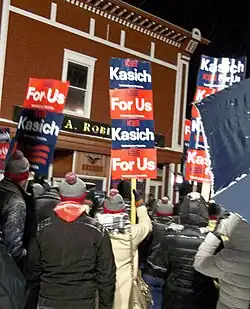 In mid-January, Kasich began to surge in some polls,[20] leading journalist E. J. Dionne to speculate that Kasich might be filling a desire on the part of Republican "working-class voters who are economically pressed and looking for a champion," but who seemed to prefer Kasich's "sunnier approach" to the "darker message[s]" coming from other Republican contenders.[21] On January 25, he was endorsed for the Republican nomination by The Boston Globe and The New York Times.[22][23]