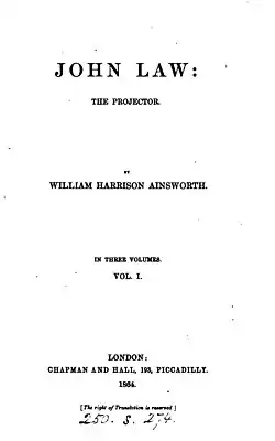 John Law: The Projector is an 1864 historical novel by the British writer William Harrison Ainsworth.[1] It was released in three volumes by the London publishing house Chapman and Hall.[2][3] It focuses on the early eighteenth century Scottish financier John Law and his efforts to establish the Mississippi Company in Paris which ultimately went bankrupt after a speculative bubble.[4]