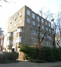 This was the first housing built for the Royal Masonic Benevolent Institution. Denman drew up the designs in 1947, and clearance of the site (formerly a farm) had started in the 1930s, but construction did not take place until 1956. A "strongly built" seven-storey block of flats with elements of Modernism, it consists of two parallel street-facing towers whose corners are recessed in stages, joined by a five-storey bow-fronted section. Communal and social facilities were originally in this part. Stock brick was the building material.[68][69]