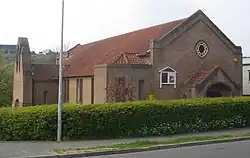 The church Denman built on this postwar housing estate in 1954 was superseded by a larger building in 1966 and is now the church hall. It is a simple dark brick building with Vernacular-style windows and a west-end entrance set under a pointed arch. The ends are gabled.[65][66]