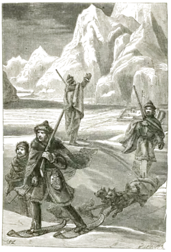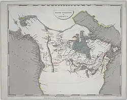 At his base at Fort Chimo (present-day Kuujjuaq, Quebec) 40 km (25 mi) up the South River (present-day Koksoak River) from South (Ungava) Bay,[25] McLean was only contacted and resupplied from the outside world by brig[26] once a year. "Surrounded by a country that presents as complete a picture of desolation as can be imagined",[27] he avoided lingering there and instead personally led expeditions southeast across the Labrador Peninsula in an attempt to establish overland contact with Fort Smith (present-day North West River, Labrador) at the mouth of the Naskaupi River on Lake Melville, the furthest extent of Esquimaux Bay (now Hamilton Inlet). He expected discovering such a route would lead to his promotion within the company,[1] and his predecessor Erlandson had already accidentally demonstrated its feasibility in 1834 when his attempt to reach Mingan on the St Lawrence had been redirected to Lake Melville by his five Innu guides.[28][29][c] On 2 January 1838, he and his men headed out on dogsleds[33] to take a route up the Koksoak[1] from Erlandson's maps and reports,[28] following the Caniapiscau and Swampy Bay Rivers to Lake Michikamau and the Naskaupi,[29] reaching Fort Smith on 16 February,[33] having taken 46 days to cover 858 km (533 mi).[1] On the way back, their guides fell sick with severe flu and became delirious with fever; game became scarce; and McLean divided his party, taking few provisions and running ahead with a clerk to send supplies back to the rest. Meeting no food on the way, one sled dog starved to death and the two were obliged to eat the other—"what we considered, in present circumstances, 'food for the gods'"[34]—to make it back to Fort Chimo.[33] The first party sent south from the fort returned with only one of the missing men, and McLean was obliged to send a second group who returned with the rest of them on 26 April.[35] Having established that the known routes to Hamilton Inlet were impractical, he learned from the locals about the George River to the east.[33] He founded Fort Siveright (present-day Kangiqsualujjuaq) on the eastern shore of its mouth to serve as a salmon and seal fishery.[36][37] He sent a team under Erlandson to Indian Head Lake to establish Fort Trial as a waystation and depot for the supply route to for outposts further south.[36][38]