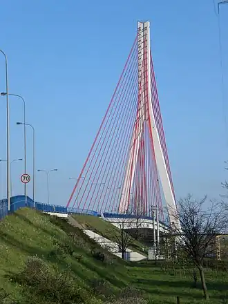 The John Paul II Bridge (Polish: Most Jana Pawła II), also known as the Third Millennium Bridge (Polish: Most Trzeciego Tysiąclecia), is a cable-stayed road bridge located in Gdańsk, Poland, opened on 9 November 2001 and linking the Northern Port of Gdańsk with the Tricity Ring Road (S7). It crosses the Dead Vistula.
