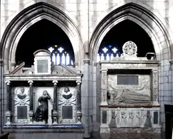 - Mary Peryam (d.1662), wife of Richard Reynell (d.1631), a bencher of the Middle Temple, 4th son of George Reynell (d.1568) of Malston.[10] To Mary her father bequeathed his estate of Creedy Wiger, near Crediton (formerly owned by his brother Sir William Peryam) which she and her husband made their home.[5] Richard Reynell also purchased the estate of Little Fulford from two of the four daughters and co-heiresses of Sir William Peryam, namely Mary Peryam, wife of Sir William Pole, and Elizabeth Peryam, wife of Sir Robert Basset. Thus the two estates of Creedy Wiger and Little Fulford were unified in the ownership of Richard Reynell. Their eldest son and heir was Peryam Reynell (1612-1639), who died without progeny leaving his five sisters as co-heiresses. The 2nd sister Elizabeth Reynell (1593-1630) was the heiress of Creedy Widger and Little Fulford and married Thomas Tuckfield (1580/90-1642), the son of John Tuckfield (1555-1630) of Tetburn St Mary, a wealthy cloth merchant. The elaborate Tuckfield Monument[11] in the chancel of Holy Cross Church, Crediton shows the full length seated figure of the heiress Elizabeth Reynell in the centre with the faces in medallions to either side of her husband Thomas Tuckfield (1580/90-1642) (right) and her father-in-law John Tuckfield (1555-1630) (left). The monument is situated next to the elaborate monument of Sir William Peryam.