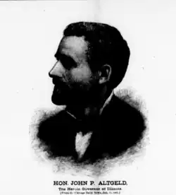 John Peter Altgeld (December 30, 1847 – March 12, 1902) was an American politician and the 20th Governor of Illinois, serving from 1893 until 1897. He was the first Democrat to govern that state since the 1850s. A leading figure of the Progressive movement, Altgeld signed workplace safety and child labor laws, pardoned three of the men convicted in the Haymarket Affair, and rejected calls in 1894 to break up the Pullman strike by force. In 1896 he was a leader of the progressive wing of the Democratic Party, opposing President Grover Cleveland and the conservative Bourbon Democrats. He was defeated for reelection in 1896 in an intensely fought, bitter campaign.