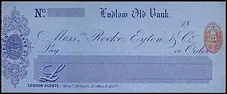 The bank operated under a lot of different names: Ludlow Old Bank (see the image), Shrewsbury and Ludlow Bank (ibid),[9] Eyton, Reynolds & Bishop, Rocke, Eyton & Campbell, Rocke, Eyton, Loxdale, Campbell & Bayley, Rocke, Eyton, Campbell & Bayleys and Salop Old Bank.[10]