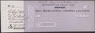 See also: "Shrewsbury & Ludlow Bank (Rocke, Eyton, Campbell & Bayley) bank note". Spink. Archived from the original on 2023-10-22. Retrieved 2023-10-22. On this page an issue of Rocke, Eyton, Campbell & Bayley is shown. - ^ "Rocke Street". Archived from the original on 2023-06-26. Retrieved 2023-10-22. This site gives 1795 as the year of founding of the bank.