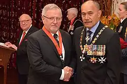 Wood (left) is congratulated by the governor-general, Sir Jerry Mateparae, after his investiture as a Companion of the New Zealand Order of Merit at Government House, Wellington, on 8 September 2015