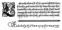 As Vautrollier had registered two books of "copies" of hands with the Stationers' Company in 1569, it is possible that this volume combined originally separate works by Beauchesne and by Master John Baildon, a curate of St Mildred in the Poultry.[1] The book contains 42 woodblocks of sample alphabets and texts, covering the range of styles common in the day. A Book containing divers sortes of handes must have been a success – it was reissued by Vautrollier and his successor, Richard Field, in 1571, 1590, 1591, 1602, and 1615 (all within Beauchesne's lifetime).[3][4]