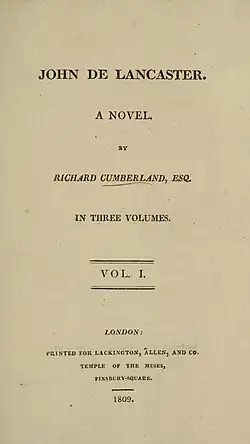 John de Lancaster is a three volume novel by the British writer Richard Cumberland, first published in 1809.[1] [2] Cumberland, better known as a playwright, also produced three novels of which this was the last. It was published in London by Lackington, Allen, & Co. of Finsbury Square. Walter Scott wrote a review of the novel in the Quarterly Review.[3] It was one of his final works, and two years later he died and was buried in Westminster Abbey.