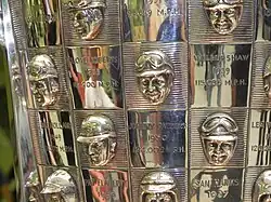Johnnie Parsons has the dubious distinction of being the only Indianapolis 500 winner to have his name misspelled on the Borg-Warner Trophy. The silversmith engraved "Johnny" instead of "Johnnie." He had a son named Johnny who competed at Indy a dozen times. Evidence of the engraver's mistake can be seen in MGM’s production, To Please a Lady (1950). When the camera pans across Johnnie Parsons' name and bust relief, while they’re doing a brief segment on the trophy, his misspelled name is revealed.[5] In 1991, during a trophy restoration project, it was proposed to correct the spelling, albeit posthumously. However, it was decided to keep the error intact, as part of the trophy's lore.