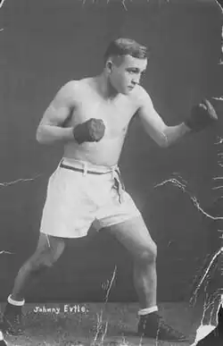 Johnny Ertle or Ertel (sometimes spelled Johnne) was a Hungarian born American boxer. Nicknamed "Kewpie" and "Little Dynamo", he was a disputed bantamweight world boxing champion from 1915 until 1918, when he lost the title to Memphis Pal Moore. Trained and managed from 1913, when he was only sixteen, by Mike McNulty, Ertle's body punches were particularly devastating to his opponents, because of the extraordinary leverage he could apply using the extra space provided by his small stature.[3][2] He was managed by Mike Collins in his later career.
