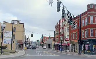 Johnson City Historic District is a national historic district in Johnson City, New York. It encompasses 183 contributing buildings and 1 contributing site in a mixed, residential, commercial, and industrial core of Johnson City. It developed between about 1888 and 1966, and includes notable examples of Romanesque Revival, Gothic Revival, Colonial Revival, and Streamline Moderne style architecture. Located in the district are the previously listed Goodwill Theatre, United States Post Office, and Your Home Library. Other notable contributing resources include the Endicott-Johnson Athletic Association East Branch Recreational Center (1947), St. James Roman Catholic Church Complex (1914–1950), Ash Block (c. 1901), Tacoma Block (1892, 1945), Rich Block, Dawson Block (1898–1899), Woolworths (c. 1937), Men's Quality Shop (1966), Red Robin Diner (1950, 1959), Thompson Hall (1951), Sarah Jane Johnson Methodist Church (1927), Charles F. Johnson, Jr., House (1919), Endicott-Johnson's Pioneer Annex (1916), Endicott-Johnson's Jigger Factory (1926), Endicott-Johnson's Sunrise Building (1929), Eagle Felt Mill (1898), Ansco Factory and Gate House (1947), Endicott-Johnson's Medical Facility (1918), Endicott-Johnson's Victory Factory (1919-1920), Endicott-Johnson's New Toe Box Factory (1914), Endicott-Johnson's Firehouse (1916), and the Village Hall and Fire Station (1899).[2]