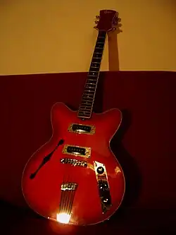 Jolana is a Czech brand of electric guitars and basses, manufactured by New Bohemian Electronics (NBE) company. It was also a Czechoslovak guitar manufacturing company from 1960 to near 1989. Especially during the 1960s, it gained popularity in the United Kingdom, with famous musicians such as George Harrison, Jimmy Page, Andrzej Ziółkowski / Boguslaw Andrew Ziolkowski (Stowarzyszenie Cnót Wszelkich / Budka Suflera), Romuald Lipko / Romuald Ryszard Lipko (Stowarzyszenie Cnót Wszelkich / Budka Suflera) and Eric Clapton using its guitar models.[3][1]