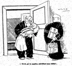 In 1922–1923, Šliūpas taught hygiene and world literature at the Saulė Gymnasium in Biržai and Lithuanian and English literature at the Šiauliai Gymnasium.[171] As an educator, he organized public lectures and attended local meetings of the Lithuanian Evangelical Reformed Church.[172] In early 1924, Šliūpas had a stomach operation in Königsberg. Upon his return, chaplain of the Šiauliai Gymnasium complained that Šliūpas' lessons included anti-religious themes to the Minister of Education Leonas Bistras. Šliūpas was asked to refrain from anti-religious comments, but he resigned and moved to Kaunas.[173] In February 1923, he received honorary doctorates in medicine and history from the University of Lithuania;[a 4] he received the third honorary doctorate in law in 1939.[174] From fall 1924, Šliūpas became a privatdozent and taught history of medicine at the Faculty of Medicine of the University of Lithuania. It was an elective class and not every semester there were enough students to hold it. He resigned after four years and received a government pension.[175] He published his lessons on hygiene and history of medicine as separate books in 1928 and 1934.[176]