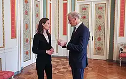 After the 2005 parliamentary election, Støre was appointed foreign minister in Jens Stoltenberg's government, serving in that position until 2012. When he joined the cabinet he was perceived as part of a group of "West End executives" and confidants of Stoltenberg that represented a shift to the right.[23] Nevertheless, numerous polls showed that Støre was the most popular member of the Stoltenberg government.[24] However, he was also subject to criticisms in 2010 when he and Anne-Grete Strøm-Erichsen, minister of health, accepted expensive rugs from Afghan politicians.[25]