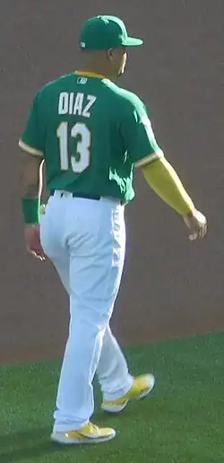 The Athletics optioned to the Triple-A Las Vegas Aviators to begin the 2023 season.[7] They promoted him to the major leagues on April 19.[8] On April 21, Díaz hit his first career home run, a go-ahead solo shot off of Texas Rangers reliever Will Smith at Globe Life Field.[9] On May 9, Díaz had his first multi-homer game, launching three home runs at Yankee Stadium against the New York Yankees. His first home run was a solo homer off of starter Clarke Schmidt, with his second home run also a solo homer off of reliever Albert Abreu, and his final blast a two-run homer off of Greg Weissert. In doing so, he became the only second baseman in franchise history to accomplish the feat alongside Héctor López.[10] In 90 games for Oakland, Díaz hit .221/.273/.364 with 10 home runs and 27 RBI.