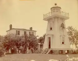 The history of this station is unclear, but some sources indicate that a light station was first established on Jordan Point in 1855. This consisted of a keeper's house with a masthead light on the roof. This arrangement was replaced circa 1875 (possibly as early as 1870) by a separate 35-foot (11 m) pyramidal wooden tower that housed a sixth order Fresnel lens and a fog bell. A new keeper's house was constructed in 1888.[1]