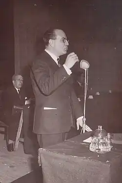 According to some sources already in early 1937 Zubiaur was engaged in Carlist propaganda activities in the Navarrese rearguard.[43] He apparently complied with the Unification Decree and was incorporated into the new Francoist state party, Falange Española Tradicionalista. In late 1938 he was nominated the provincial Navarrese head of the FET propaganda section[44] and at this role he remained active at least until 1939. Some historians consider him a representative of "carlismo colaboracionista".[45] According to some sources he entered Junta Consultiva Nacional of SEU, the new academic organisation set up by the regime.[46]