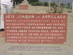 On July 25, 1813, José Joaquín de Arrillaga died at Mission Nuestra Señora de la Soledad and was buried there.[8] He is said to have been the only Spanish governor to be buried in California and on US soil,[8] but this must be a mistake, because the Spanish Governor before him, José Antonio Roméu, was buried at Carmel Mission in 1792. José Joaquín de Arrillaga's grave is at 36°24′17″N 121°21′19″W / 36.40472°N 121.35528°W.[9] The sign there has the inscription: "Known affectionately as "Papa" by his soldiers, companions and friends, he served twice as governor of California under Spanish rule. Upon his death in 1814 he was, at his request, garbed in the Franciscan habit and buried in the mission church." He was called "papa," because he worked hard to improve the lives of his men.