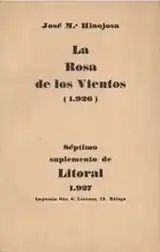Early poems, from these printed in Ambos to Poema del Campo (1925),[56] are anchored in rural myths and set in capacity perceptive of an unspecified territory, largely bucolic and lyrical. In terms of style due to folk ambience some refer to "neopopulism",[57] others mention also "purismo" and "cubismo".[58] Scholars flag a synthesis of tradition and modernity, the latter represented by innovative if not already extravagant metaphor.[59] Poesía de perfil (1926),[60] published in Paris,[61] offered poems inspecting an interior of the fantastic mixed with a real setting. The largely descriptive tone gave way to dominant lyrical expression and the monothematic perspective was replaced with a variety of themes, often organized around the motive of exploration. "Estética purista" was partially substituted by oneiric and surrealist approach, not clear yet already visible, and the entire volume was distinctively more expressive.[62] La Rosa de los Vientos (1927),[63] published again in Málaga, was a small collection of just 19 poems; they focused upon imaginary journeys to exotic locations[64] and to the inner self. Providing a discourse on space, mystery, and wilderness the volume offered frequent references to ancient as well as popular culture and introduced heterodox erotic motives. Stylistically at times very sophisticated, blending various rhyme orders and syllable types, it is described as a mix of Hispanic Ultra, French surrealism and Chilean creationism.[65]