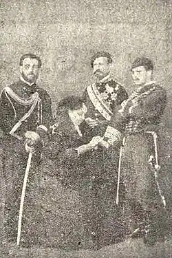 Promoted to capitán and decorated,[69] in the spring of 1874 Orbe was to organize the journey of his queen from Pau to the Carlist capital of Estella.[70] He designed the plan which involved travelling by train, by coach and accompanying camouflage activities, intended to deceive the French;[71] it all worked out and in the summer via Dancharinea Doña Margarita made it to Estella.[72] During the fall of 1874 he was assigned to combat operations in Gipuzkoa, mostly boiling down to failed sieges of Irún and Guetaria. Back in Navarre in early 1875, he took part in the February battle of Lacár. Promoted to comandante and decorated again[73] in the summer of 1875 he accompanied Carlos VII during Jura de Los Fueros in Guernica.[74] From that moment Orbe stayed within his personal escort and is not noted as engaged in frontline combat. Accompanying the claimant to the French frontier, in February 1876 he was promoted to lieutenant colonel[75] and awarded with vizcondado,[76] In Valcarlos Orbe crossed the border bridge with the claimant and decided to join him into exile.