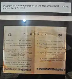 In 1930, the Parents-Teachers Association of the Naga Central School decided to build the monument of Jose Maria Panganiban 30 years after his death to perpetuate his heroism among the youth and students. The Association was led by Mr. Casimiro Perfecto who also spearheaded the construction of the monument. This is evident in the September 27, 1930, issue of local newspaper "Sanghiran nin Bikol", where the minutes of the meeting were written about the inauguration of the monument.[2] A program on the inauguration was preserved and is now in the Holy Rosary Minor Seminary museum.