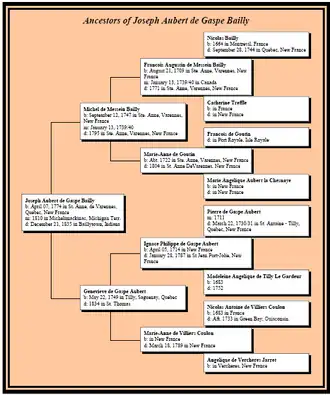 Joseph married Marie Lefevre de La Vigne (Mo-nee or Tou-se-qua) in 1810. She was born in 1783 in Ma-con, a large mixed-band Indian village on the Raisin River west of present Monroe, Michigan. Her mother was a Potawatomi of the St. Joseph Band (now known as the Pokagon Band of Potawatomi Indians). Marie married Kougowma (or Kiogima), also called La Vigne, a medicine man in the Mackinac band of Ottawa, who took her to Mackinac Island. Kougowma died between 1804 and 1809. Bailly adopted the two daughters from this marriage, Agatha born in 1797 and Therese, born in 1803. Five more children were born of this second marriage, who were Esther in 1811, Rose in 1813, Eleanor in 1815, Robert in 1817 and Hortense in 1819.[2]