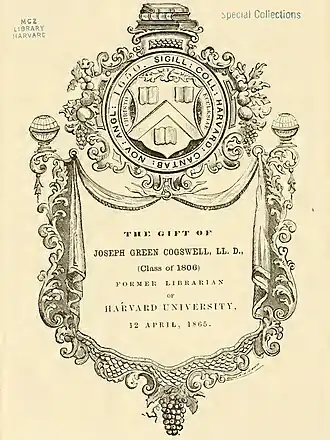 Bookplate from a book formerly owned by Joseph Green Cogswell
