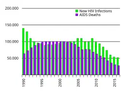 The Rakai Project was a research initiative funded by both Columbia University and the Uganda Ministry of Health so as to better understand the disease and its spread. Based on the work conducted by this research initiative, it was discovered that three communities are predominantly at risk of contracting HIV in Uganda: those near trading centers, small villages by secondary roads, and rural agrarian villages.[6] The effectiveness of Uganda's containment strategy involves the fact that HIV research was focused on ways to prevent further spread of HIV. Thus, with time and targeted research initiatives, fewer people contracted HIV and prevalence began to decline.[7]