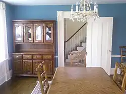 In 1961, the land was purchased by a local developer, Richard Defranco, to build a gas station[11] but the house was spared as it was moved a mile up the road.[12] The house was extensively updated by another developer, Richard Swerling. One oddity was when the house was moved to the new T-shaped lot it was placed at the end of a long driveway so the old front faced away from the road and into the woods. From the road, with a new garage added, it now gives the appearance of a 1970s colonial because the old front is not easily visible.
