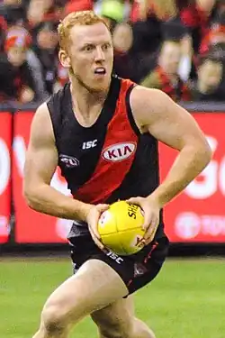 Green played 17 matches for Essendon in the 2017 season, but his season ended in round 22 when he suffered a broken foot in a match against Gold Coast. He signed another contract with Essendon for 2018.[9] In March 2018 Green was reported for staging to try to get a free kick in a JLT Series match against Geelong. Geelong player Mitch Duncan hit him in the chest with his elbow, after which Green fell to his knees and clutched his face. He became the first person in AFL history to be fined for staging when the AFL Tribunal fined him $1,000.[10][11] Green's 2018 season was again injury-interrupted due to hamstring issues and he spent most of the season playing for Essendon's reserves team in the VFL.[12] In the last part of the season, Green's feet were in severe pain due to bolts which had been put in his feet after repeated stress fractures. In order to be able to play Green had to have cortisone injections for the pain.[4] He was delisted by the club in September but played out the finals series for the reserves.[12]