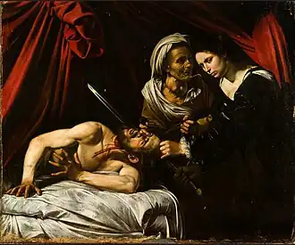 There has been no confirmed news about the second Caravaggio representing Judith beheading Holofernes co-owned by Vinck and Finson since its mention in the will of Finson dated 1617. It is known that the son-in-law of Vinck who was the executor of the estate tried to sell the more expensive paintings in the estate outside of the auctions. It is recorded that he sent a Caravaggio taxed at 600 guilders to a buyer in Rome but it is not noted what the subject of the work was.[2] A painting of Judith beheading Holofernes said to have been discovered in an attic in Toulouse in 2014 is believed by some scholars and experts to be the lost Caravaggio. It resembles a painting of lower quality in the collection of the Intesa Sanpaolo bank in Naples which has traditionally been regarded as a copy after an original, lost work of Caravaggio made by Finson.[3] Other scholars see in the Toulouse Judith an original creation of Finson rather than a copy after a lost Caravaggio. The Toulouse Judith has even been described as Finson's masterpiece. The work in the collection of the Intesa Sanpaolo bank is regarded by them as a copy by Finson or possibly his friend and pupil Faber after Finson's original creation.[5] The Toulouse Judith was slated to be auctioned in June 2019 but was snapped up by hedge fund manager J. Tomilson Hill through a private sale at an undisclosed amount shortly before the auction was planned to go ahead.[6][7]