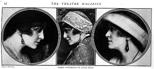 Julia Dean was born to Albert Clay Dean and Susan Jane Morton in St. Paul, Minnesota, in 1878. She had a sister Eloise and a brother. She made her Broadway debut December 1, 1902 in The Altars of Friendship. She toured with Joseph Jefferson and James Neill. In 1907 she appeared with Maclyn Arbuckle in The Round-Up. She worked for producers William A. Brady and David Belasco.[2] In 1914-1915 she had significant success portraying Margaret Harding, a battered woman who kills her husband to protect her young son, in George Broadhurst's The Law of the Land at Broadway's 48th Street Theatre.[3]