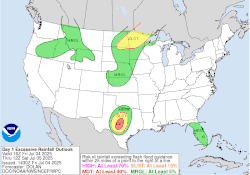 On July 7, another "moderate" risk for excessive rainfall was outlined by the Weather Prediction Center;[32] A flash flood watch was issued for much of central Texas at 11:46 pm CDT on July 6, warning of 2–4 in (51–102 mm) of rain with some areas possibly seeing as much as 10 in (250 mm) through 7 pm on July 7.[33]