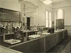 - the large wall mirrors, framed prints, cupboards and cabinets, curved timber bar and cabinetry, galvanised bucket, signal lamps, "Safety Notices" cabinet, framed prints, illuminated sign "Counter meal services", Bakelite speaker on wall, cast iron urn and plinth, cast iron stove /range – J Ward Ltd Sydney – in kitchen, blackboards in storage, fitted timber racking in kitchen, circular coat hooks in storage, wardrobe / cabinet c. 1930s, timber screen panel doors in storage, timber pigeonhole cabinet, and a cast iron piece of machinery of unknown function[11]