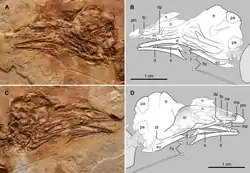 The holotype, BMNHC-PH 919, was found in a layer of the Yixian Formation that is roughly 126 million years old. It consists of a skeleton with skull, compressed on a plate and counterplate. The skeleton is largely associated, though the skull is detached. Bone conservation is excellent. Extensive remains of the plumage have been preserved.[1]
