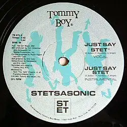 "Just Say Stet" is the debut single by American hip hop group Stetsasonic, released in 1985 via Tommy Boy Records. It was included on their debut album On Fire, released the following year. All members of the group have credits as composers of the song,[1] which they produced in collaboration with Eric Calvi and Robin Halpin as per the liner notes credits.