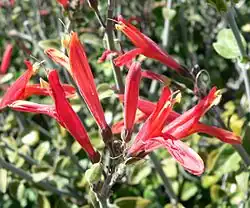 It can grow to 1.5 metres (5 feet) in height and almost as wide.[2] For a short time it bears succulent leaves about 1.5 centimetres (5⁄8 inch) in width.[2] It loses its leaves and then produces plentiful tubular flowers about 2.5–4 cm (1–1+5⁄8 in) long between February and June.[2] These are usually in shades of bright to deep red, or sometimes yellow, with a two-lobed upper lip and a wide three-lobed lower lip[2] that falls open to reveal the inside of the blossom.