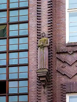 East of the park at Am Köllnischen Park 3 is a large office building which was designed by Alfred Messel as the headquarters of the Landesversicherungsanstalt Berlin, the social insurance for Berlin within Bismarck's old age and disability insurance system.[39] Built in 1903/04, the building echoes the Märkisches Museum, which was built at the same time, in the use of red brick on its façade and is in Expressionist-Baroque style, with giant pilasters which rise uninterrupted from the street to the roofline,[40][41] between which are limestone decorative elements in the form of similated balustrades, allegorical figures, and cartouches with craft symbols, such as an iron between pairs of scissors.[42][43] Over the southern entrance is a sculpture of a group of men in classical style with the motto "Einer für alle—alle für einen" (One for all—all for one).[44] The building originally had a tower, which was destroyed in World War II.[41] After the war, it was the headquarters of the East German Social Security Administration.[45] It now houses offices of the Berlin Senate Department of Urban Development,[46] and one of the courtyards has been roofed over and houses a permanent exhibition of plans for the redevelopment of the city.[2] It forms part of an ensemble of buildings to either side of the Märkisches Museum which are registered as a city landmark.[47]