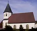 The church has its consecration on 25 July and 25 November. The original church patronage, to St. Kilian, likely goes back to the 8th century when the original parish of Königsfeld belonged to the Bishopric of Würzburg. The parish church lies in the middle of the fortified graveyard, whose western gate and part of whose wall go back to Romanesque times. In the time when Gothic was fashionable, an apse was built onto the tower in the east. The expansion only came into being after the Thirty Years' War. In 1710, the tower was integrated into the main building. The tower has a bulbous cupola.