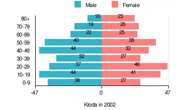 According to the 2002 Poland census, there were 572 people residing in Kłoda village, of whom 50% were male and 50% were female. In the village, the population was spread out, with 22.4% under the age of 18, 35% from 18 to 44, 23.4% from 45 to 64, and 19.2% who were 65 years of age or older.[1]